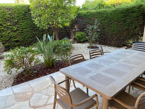 Terrace - Table and eight chairs, ideal for outside dining or relaxing with a glass of wine. Patio doors lead out to the manicured garden area which is very secluded. Six private sunloungers are provided.